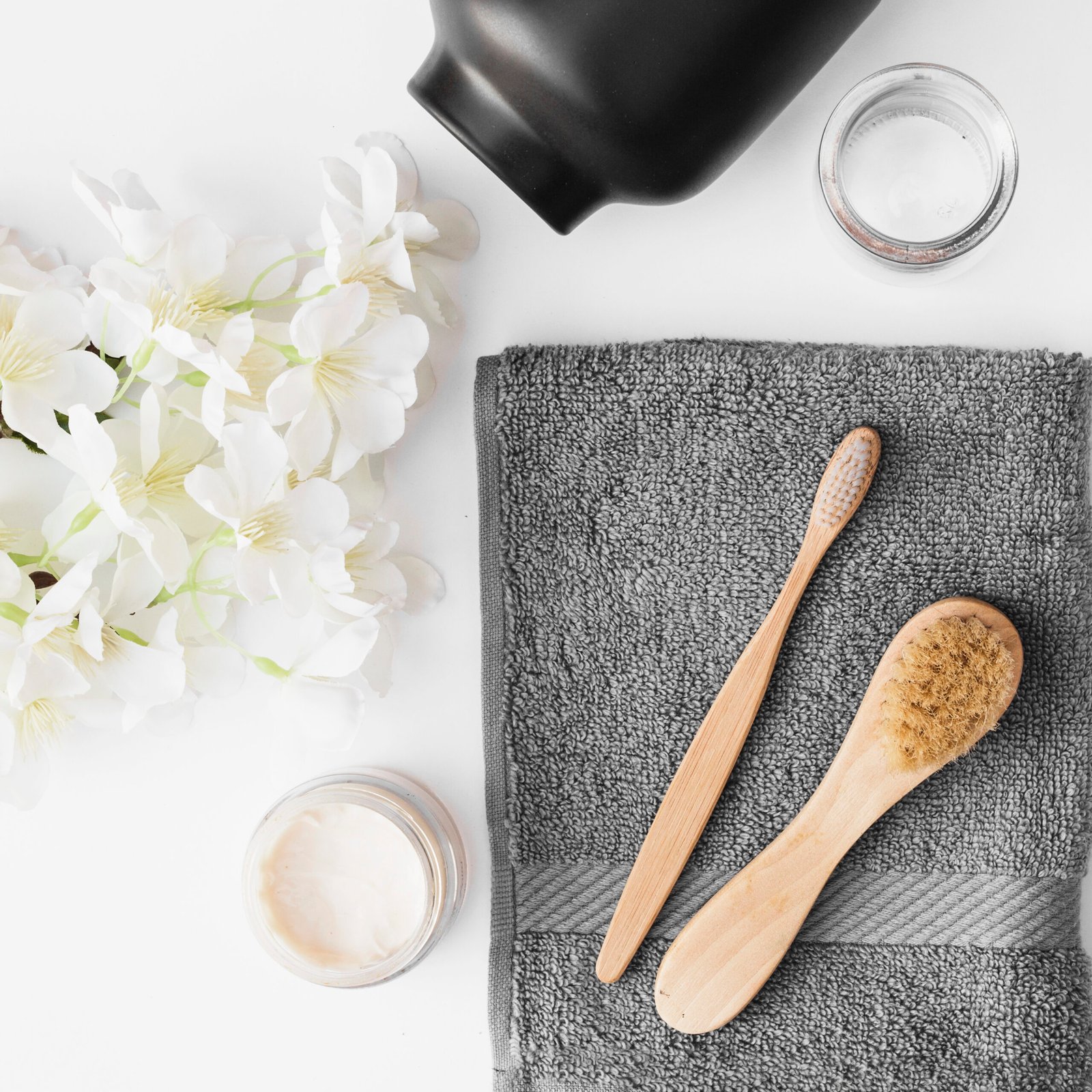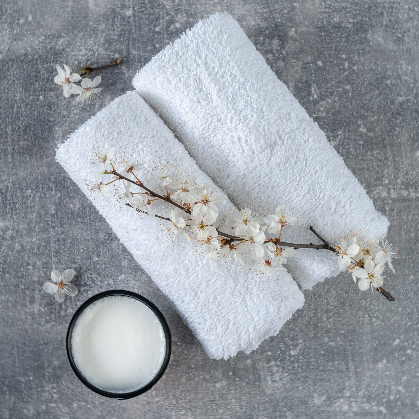 Twisted bath towel with blooming cherry branches and body cream on light gray background. SPA concept. Minimalism, soft focus, top view, close up.